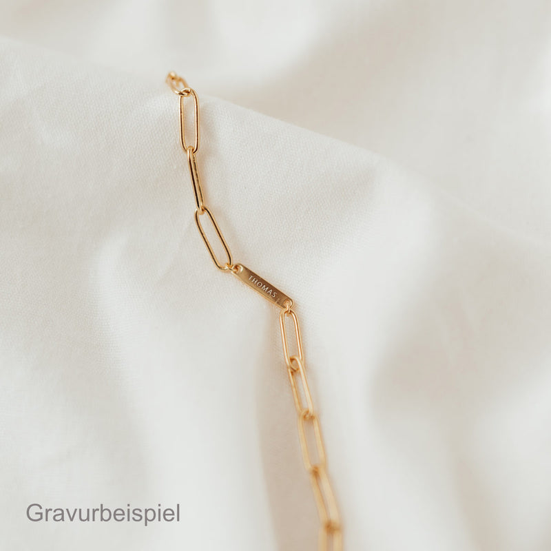 Bei vergoldetem 925er Sterlingsilber erscheint die Gravur in einem eleganten Weiß- oder Silberton, der dem Schmuckstück einen edlen und zeitlosen Look verleiht. Edelstahlgravuren hingegen zeigen sich in einem kräftigen und kontrastreichen Schwarz, das für einen markanten und modernen Stil sorgt. Die Lasergravur auf massivem Gold ergibt einen dezent helleren Goldton, der auch feinste Gravuren sichtbar und präzise darstellt und so dem Schmuckstück eine subtile Eleganz und ausgeprägte Schönheit verleiht.